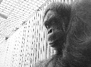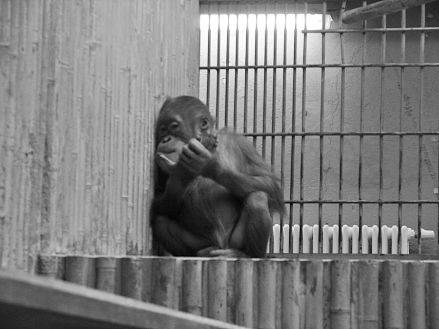 Tatsächlich hocken die Orang Utans im Dresdner Zoo auf nacktem Betonboden herum und langweilen sich zu Tode. Die anschauliche Beschreibung ihres Lebens in Freiheit, nachzulesen an den Wänden des Gefängnisses, in dem sie ihr Leben lang einsitzen, ist an Zynismus kaum zu überbieten.