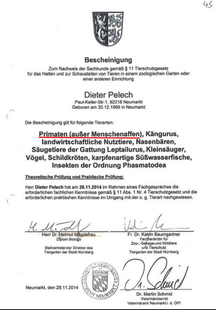 Zoobetreiber Dieter Pelech verfügt offen-bar nach wie vor weder über eine Betriebs-erlaubnis für seinen Zoo noch über die Erlaubnis zur Haltung bzw. Zurschau-stellung von Menschenaffen; letztere ist in einem Bescheid des Veterinäramtes von 26.11.2014 ausdrücklich ausgeschlossen. Trotzdem hielt und hält er - um es zu wiederholen: ohne Betriebserlaubnis für seinen Zoo und ohne Haltungs- bzw. Zurschaustellungserlaubnis für Menschen-affen - seit Jahren Gibbons, also Menschen-affen. Und dies zudem in einem Käfig, der den bundesministeriellen Vorgaben für die Haltung von Gibbons eklatant zuwiderlief. (Stand 25.5.2018)