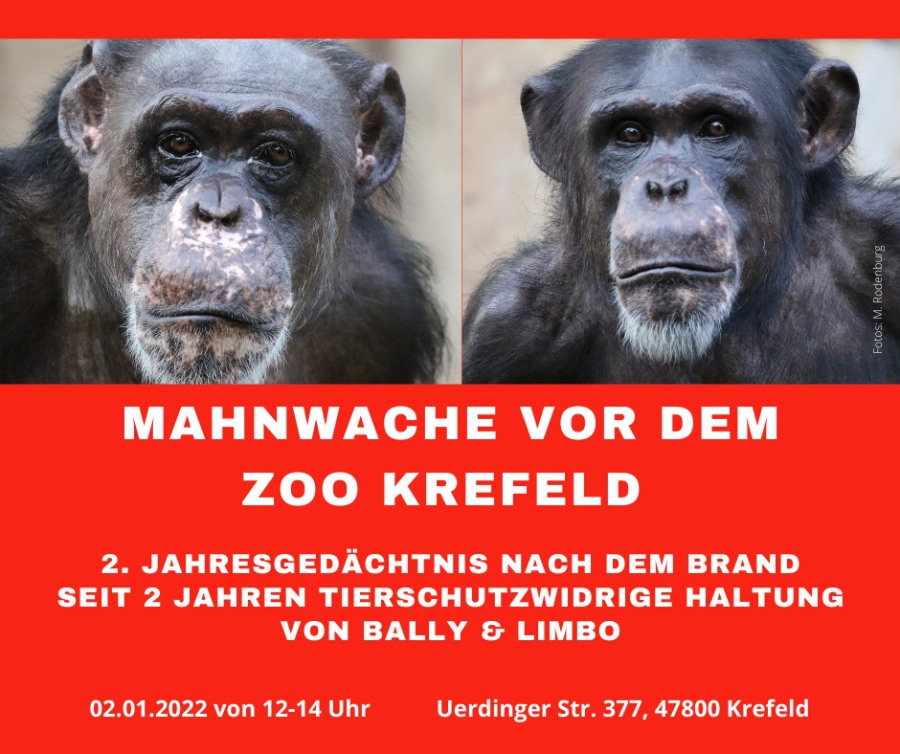 In der Silvesternacht 2021/22 jährte sich zum zweiten Mal die Brandkatastrophe im Krefelder Zoo, bei der mehr als 50 im sogenannten „Tropenhaus“ eingesperrte Tiere, darunter acht Menschenaffen, auf grauenhafte Weise zu Tode kamen: sie verbrannten bei lebendigem Leibe. Es war dies die schlimmste Katastrophe in einem deutschen Zoo seit dem Zweiten Weltkrieg.