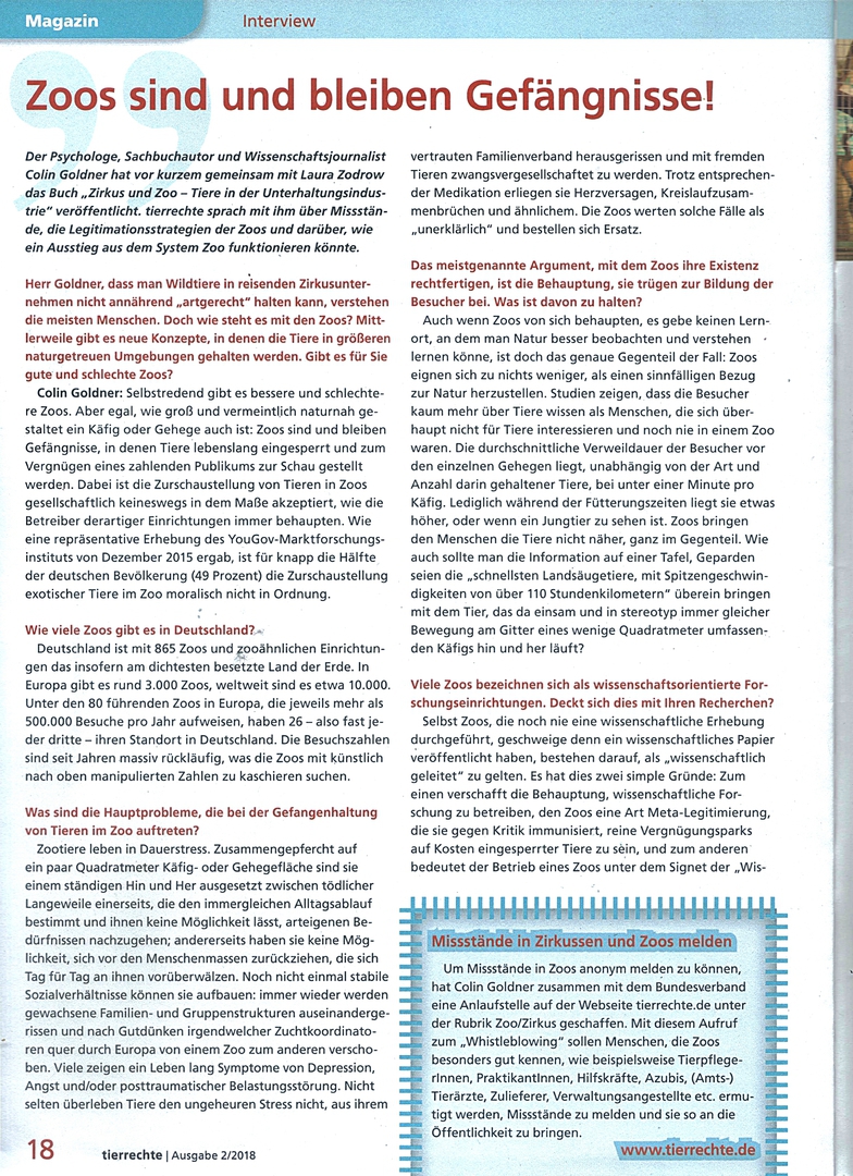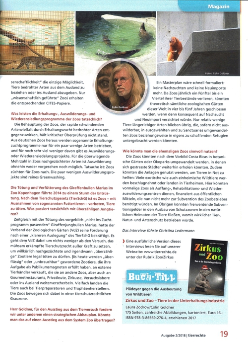 Interview mit Colin Goldner, in dem er auf Missstände in Zoos, auf die Tötung von Tieren in Zoos sowie auf die Legitimationsstrategien der Zoos eingeht.