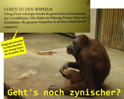 Wie auch immer: die nächsten Jahre jedenfalls werden die Dresdner Orang Utans weiter in dem maroden und unbestreitbar tierquälerischen Betonbunker herumhocken.