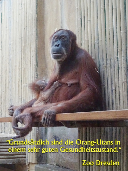 Der Dresdner Zoo, der sich rühmt, bereits seit 1873 Orang Utans zu halten und sich seither „zu einem Vorreiter zeitgemäßer, moderner Unterbringung und Pflege dieser Menschenaffen“ entwickelt zu haben, muß mit Blick auf die Orang Utans zu den europaweit übelsten Qualhaltungseinrichtungen gerechnet werden.