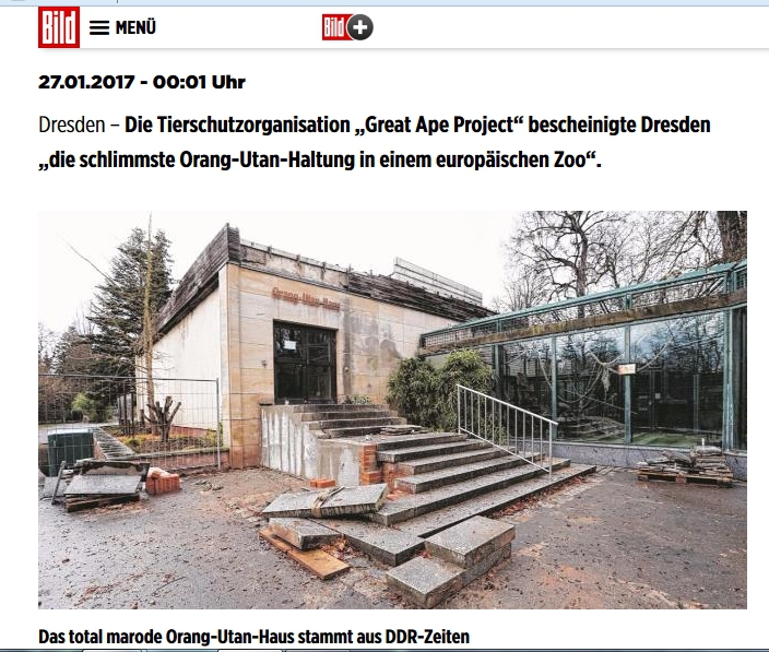 („‘Qualhaltung‘: Schwere Vorwürfe gegen Dresdner Zoo"). Selbst BILD, nicht eben bekannt für eine kritische Haltung Zoos gegenüber, wies auf die katastrophalen Verhältnisse im Dresdner Zoo hin („Schlimmste Orang-Utan-Haltung“) und illustrierte den Beitrag über den Negativ-Award mit einem aktuellen Foto des völlig heruntergekommenen Betonbunkers.