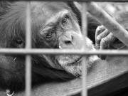 In den beiden je etwa 100qm großen Schimpansengehegen sind derzeit fünf Tiere untergebracht. Die Gehege sind rundum mit bunten Klinkerfliesen (in 70er Jahre-Optik) verkleidet, im hinteren Teil findet sich jeweils eine Art Empore, unter der, tagsüber verschlossen, die Zugänge zu den Schlafboxen verlaufen. Über Milchglasoberlichten erhalten die Gehege Tageslicht, zudem werden sie über Neonlicht erhellt; Fenster ins Freie gibt es nicht. An Einrichtung finden sich die zooüblichen Totholzstämme, Seile und Hängematten, dazu Kletter- und Hangelgerüste aus Stahlrohr. Zur Besucherseite hin sind die Gehege mit großflächigen Panzerglasscheiben gesichert. Zu den Zeitpunkten unserer Besuche war der Boden jeweils mit etwas Stroh bedeckt, an Spiel- und Beschäftigungsmaterial lagen ein paar Plastiktonnen herum.