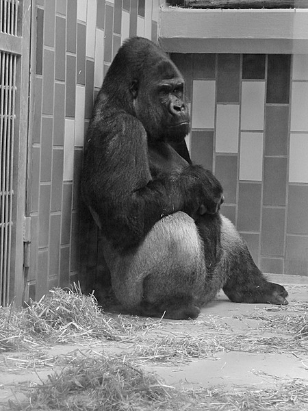 Die Innengehege der Gorillas, in denen derzeit eine dreiköpfige Gruppe untergebracht ist, weisen eine Gesamtgrundfläche von etwa 130qm auf. Sie entsprechen in ihrer Ausstattung weitgehend den Schimpansengehegen (der einzige Unterschied besteht darin, dass an der Rückseite vergitterte Fenster angebracht sind). Die Gorillas verfügen über kein Außengehege, stattdessen findet sich anschließend an die beiden Innengehege ein etwa 150qm umfassender, mit transparenten PVC-Paneelen überdachter Anbau. Nach hinten hin mit einem durchlaufenden Stahlgitter versehen, erweckt der euphemistisch als „Gorilla-Veranda“ bezeichnete Bau den Eindruck einer Art Offenstall (zumindest können die Tiere durch das Gitter hindurch einen Blick ins Freie werfen). Der Anbau ist mit Totholzstämmen, Hängematten und Seilen ausgestattet, Versteck- oder Rückzugsmöglichkeiten bietet er nicht. Der ansonsten nackte Betonboden war zu den Zeitpunkten unserer Besuche mit Stroh belegt, Spiel- oder Beschäftigungsmaterial stand den Tieren nicht zur Verfügung. Die Behauptung des Saarbrücker Zoos, die Gehege seien grundsätzlich so eingerichtet, dass die Tiere „die Möglichkeit haben, sich bei Bedarf zurückzuziehen“, ist zumindest mit Blick auf die Menschenaffen unwahr. es gibt für sie keinerlei Versteck- oder Rückzugsmöglichkeiten (für die meisten anderen Tiere auch nicht).