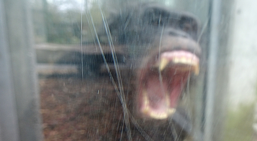 Die angeschlossene Außenanlage – direkt vis-à-vis eines neueingerichteten Löwengeheges und damit wie gehabt in Hör- und Riechweite der Raubkatzen - ist von einer 5m hohen Betonmauer umgeben, in die von der Besucherseite her verwinkelt angeordnete Sichtfenster eingelassen sind. Die beiden vorgehaltenen Schimpansen Gerome (*1996) und Flo (*1999) weisen Symptome schwerer psychischer Störungen auf.