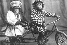 Schimpansen, so die seinerzeitige Auffassung, stellten ihrer unbestreitbar großen Ähnlichkeit mit dem Menschen wegen sozusagen von Hause aus dessen Vexierspiegel dar, was sie wie nichts sonst dazu prädestiniere, zu Unterhaltungszwecken eingesetzt zu werden. Vor allem in Zirkussen und Zoos mussten sie regelmäßig den Spaßmacher geben. Ein Schimpanse namens Fritz beispielsweise, der 1888 in den Dresdner Zoo gekommen war, musste zum Vergnügen des Publikums eine Uniform tragen und im Stechschritt auf und ab paradieren; nach seinem Tod 1890 wurde er ausgestopft und mit geschultertem Gewehr im Affenhaus ausgestellt.(37) Über einen dressierten Schimpansen namens Moritz schrieb der Hamburger Zoodirektor Carl Hagenbeck, dieser sei „geradezu der intelligenteste Affe, der mir je begegnet ist [...]. Moritz geht stets und vollständig bekleidet mit Strümpfen, Schuhen, Unterkleidern, Weste, Rock und Mütze, [...] er raucht seine Zigarette, trinkt seinen Wein.“(38) Sehr beliebt waren bis herauf in die 1960er die in vielen Zoos veranstalteten ‚Kaffeekränzchen‘, bei denen Schimpansen an einem gedeckten Tisch Platz nehmen und eine ‚vornehme Gesellschaft‘ mimen mussten. Nicht selten mussten Zooschimpansen auf Fahrrädern oder in Tretautos herumfahren, mit Musikinstrumenten hantieren oder sich in jeder sonstig nur denkbaren Weise ‚zum Affen‘ machen. Gerne wurden Schimpansenkinder auch in Kinderwägen durch den Zoo gekarrt, oft in Babystramplern und mit Babyhäubchen auf dem Kopf.