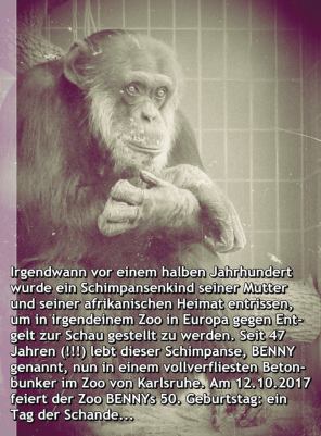 Für den 12.10.2017 kündigte der Zoo Karlsruhe eine "Ge-burtstagsfeier" für den seit 47 Jahren zur Schau gestellten Schimpansen BENNY an. Die-ser war im Alter von etwa drei Jahren als sogenannter "Wild-fang" in den Zoo gekommen. Die Feier zu seinem "50. Ge-burtstag" - den genauen Tag seiner Geburt konnte man naheliegenderweise nicht wissen - legte man gezielt in den besucherschwachen Okto-ber, um zusätzliches Publikum anzulocken.